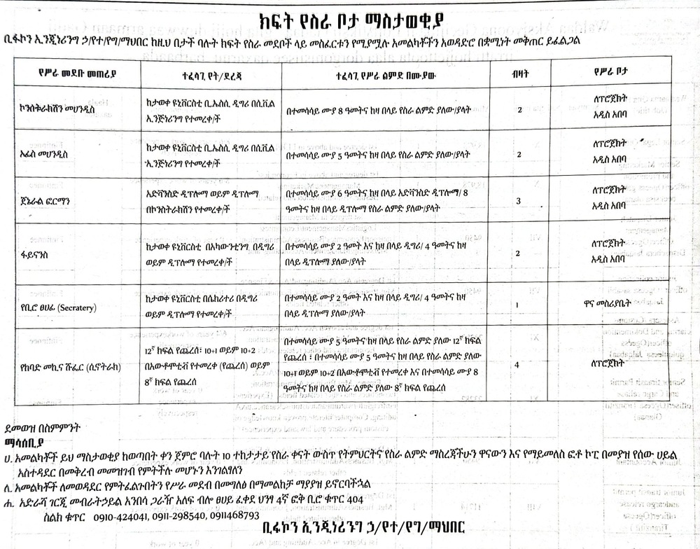 Bifacon Engineering PLC Constriction Engineer, Office Engineer, General Foreman, Finance, Office Secretary, Truck Driver (Sinotruck) 2025 Job Location: