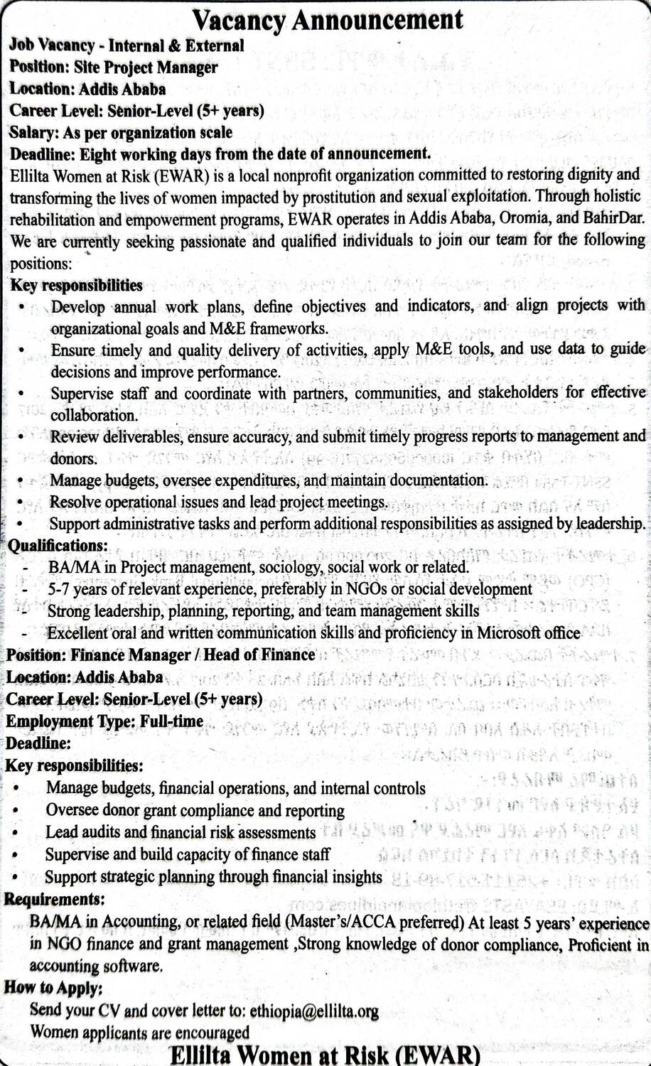 Ellilta International Job Vacancy 2025 – Very recently (August 06, 2025), the officials of the Ellilta Women at Risk (EWAR) (የኤሊልታ ሴቶች በአደጋ ላይ) invites Experienced applicants for the total 02 Site Project Manager & Finance Manager / Head of Finance positions.